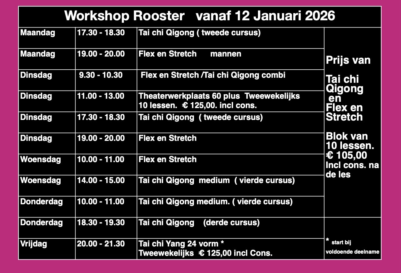 Er zijn twee nieuwe Tai chi Qigong workshops voor beginners gestart per oktober op: maandagavond van 17.00 -18.00 uur en op dinsdagavond van 17.30 tot 18.30 uur.